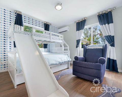 Three well-appointed bedrooms and office can be found on the lower level providing a relaxing and cool space to lay your head at night. The kids room includes a nautical theme, complete with a bunkbed and slide. The neighboring room offers a king size bed and garden views with expansive wardrobe space. Both share a full sized bathroom with luxury oversized bath tub and shower. The den can be found on the basement level, where you have fitted storage complete with a Murphy bed for guests and play area or spacious media room, perfect for kids in the family.