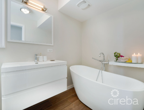 The Master Bedroom , found on the same level as the other bedrooms, provides a luxurious hideaway with en suite and expansive wardrobe, where you can lay in bed and watch the serene blues of the Caribbean Sea. Large patios doors open onto your very own deck and slice of white sand and sea. This is paradise, surely?