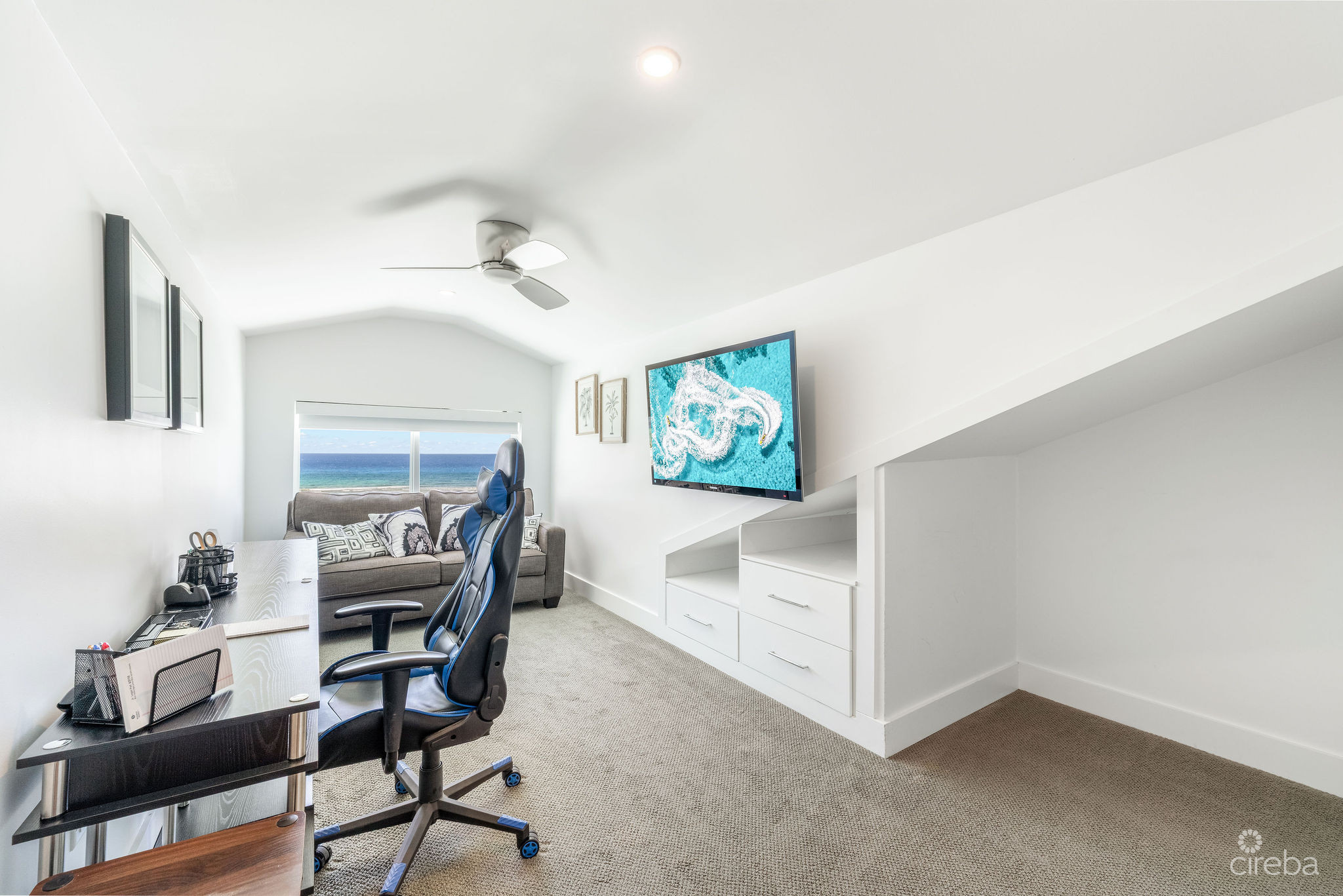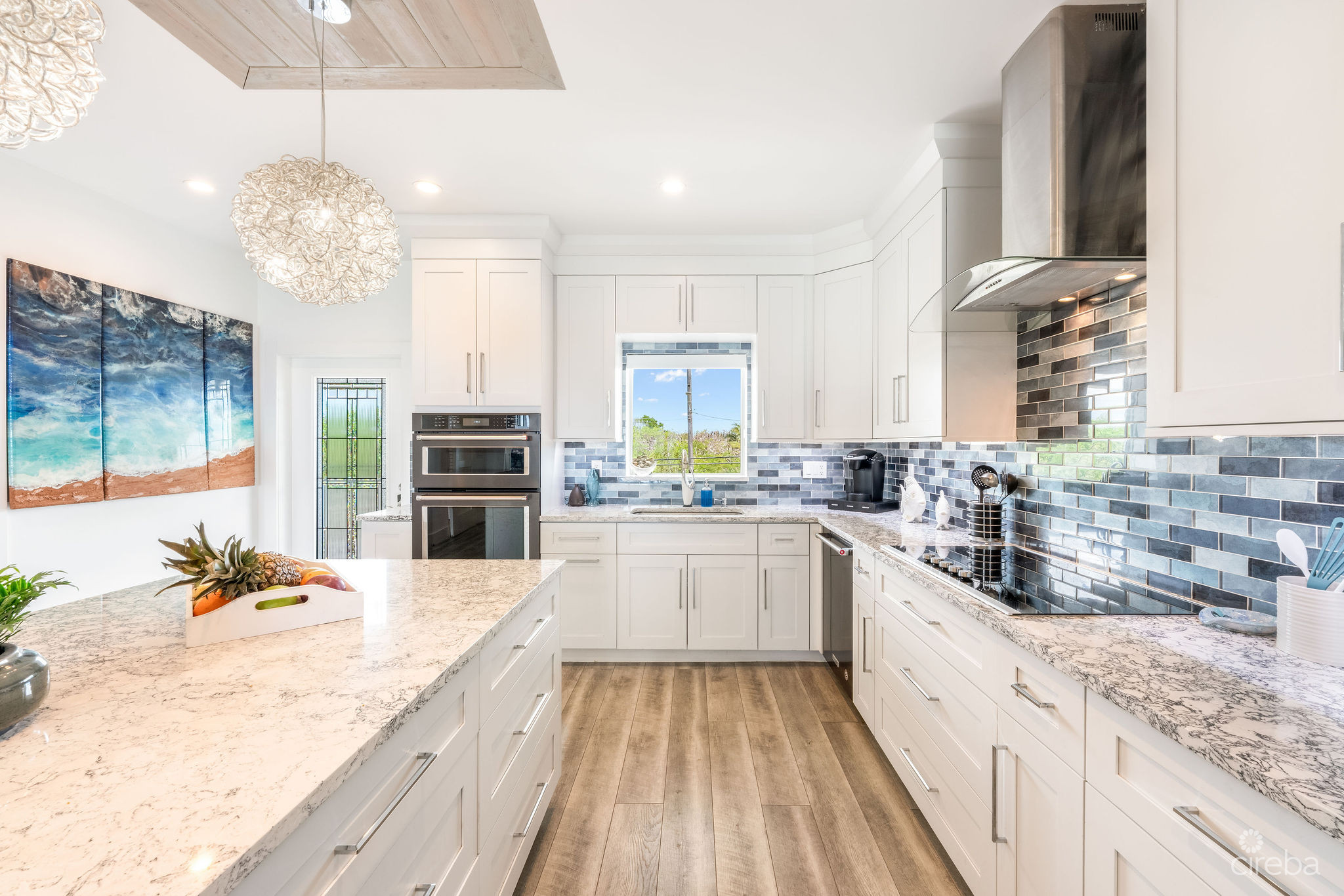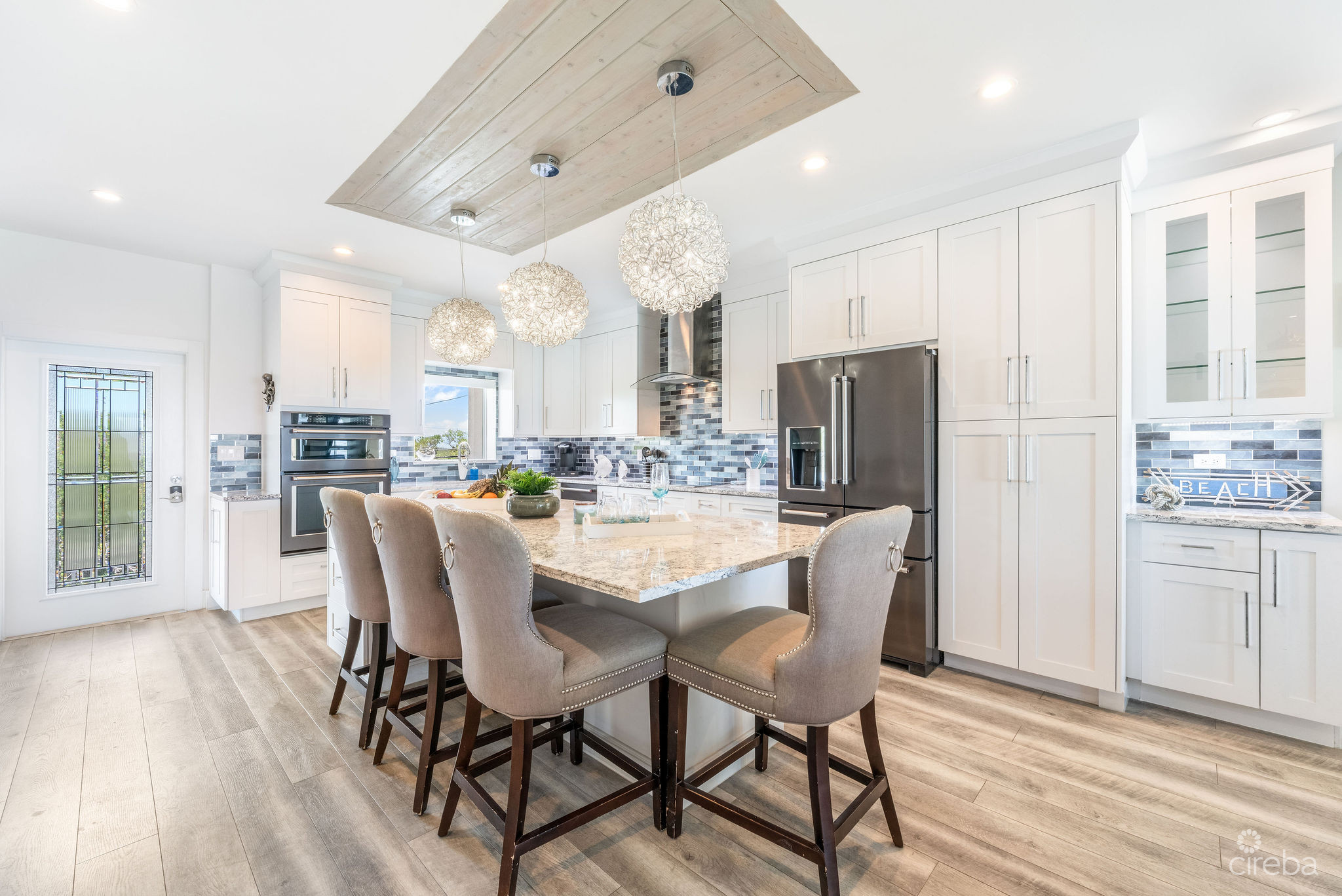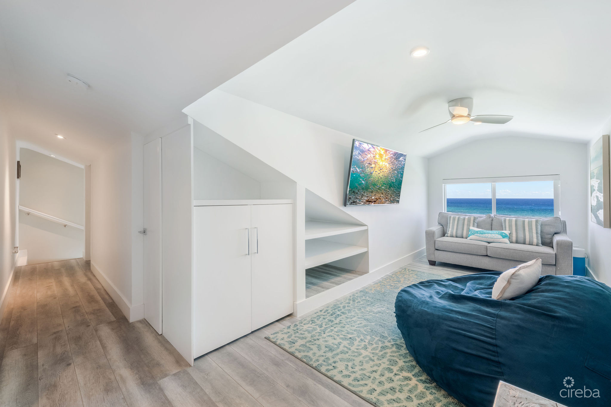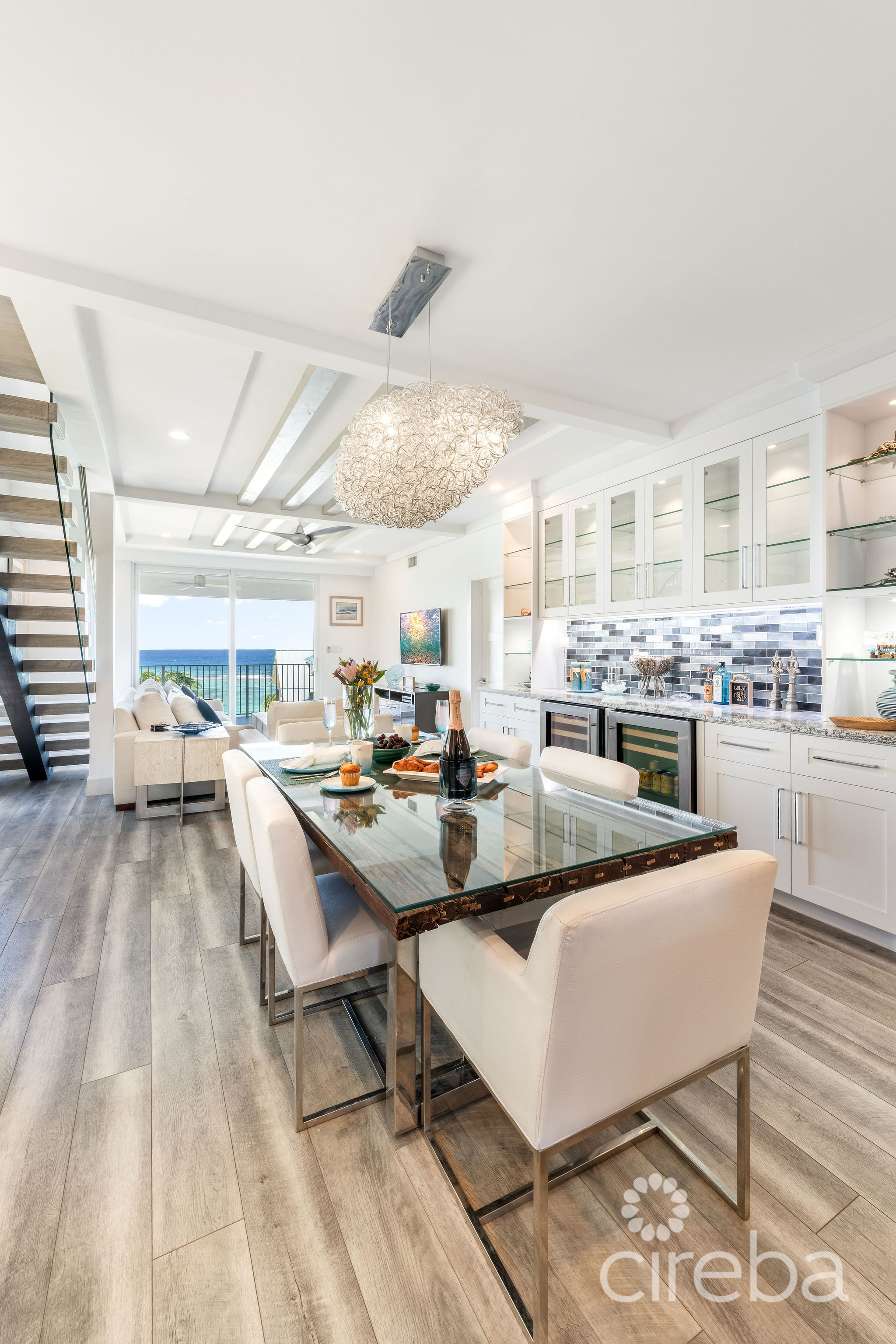 Introducing this meticulously renovated, one-of-a-kind 4 bedroom, 3 bathroom condominium, built as the builder’s personal residence. Located on the shores of Cayman’s iconic Spotts Beach – a sanctuary for resident sea turtles, shady palms, and powdery white sand – this property offers a luxurious coastal living experience like no other. This Penthouse level home boasts sweeping ocean vistas in a captivating palette of blues, greens and aquas, ensuring breathtaking views from virtually every room. From the moment you enter, the panoramic ocean views and expansive white modern cabinetry immediately capture your gaze. Designed with both comfort and functionality in mind, this home features an abundance of smart built-in storage solutions. Custom Murphy Door closet systems maximize space, incorporating built-in shoe storage, laundry hampers, and well organized shelves hidden behind mirrored panels. A true showstopper, the full glass display and LED-lit entertainment bar, paired with two under cabinet beverage centers, elevates the space – perfect for hosting guests or unwinding in style. The spacious kitchen is a chef’s dream, centered around a massive full-slab island that serves both as a stunning focal point and a functional workspace. With a premium appliance package that includes a built-in microwave and wall oven, this kitchen is designed to inspire culinary creativity. Each of the three beautifully appointed bathrooms showcases exceptional craftsmanship, featuring decorator-tiled walk-in showers with barn door glass enclosures, creating a serene spa-like ambiance. The primary bath includes a spacious vanity for everyday essentials, complemented by diffused under cabinet lighting, six foot long mirrored medicine cabinet storage, and an entire wall of custom white-gloss built-in storage cabinets, offering ample, thoughtfully designed space. The generously sized bedrooms are serene retreats, with custom built-ins and a primary suite that captures ocean views, allowing the beauty of the sea to be enjoyed from the comfort of your bed. Another highlight of the condo is the charming ocean-view games room, which doubles as a cozy retreat with a queen-size sleeper sofa to comfortably accommodate additional guests. Step outside onto the large elevated 294 square foot rear open lanai, where you can dine al fresco with a six-seat table, enjoy the tranquil ocean breeze, or unwind in the ample seating areas. Perfect for entertaining, lounging, or relaxing with loved ones, the lanai offers a true extension of your living space. This exceptional condominium perfectly blends modern luxury, functionality, and unparalleled views – all wrapped in a sleek contemporary design. Ideally suited as both a sought-after luxury vacation rental or as a spectacular resident family beach home. Schedule your private showing today! *Strata fees include water and Logic package