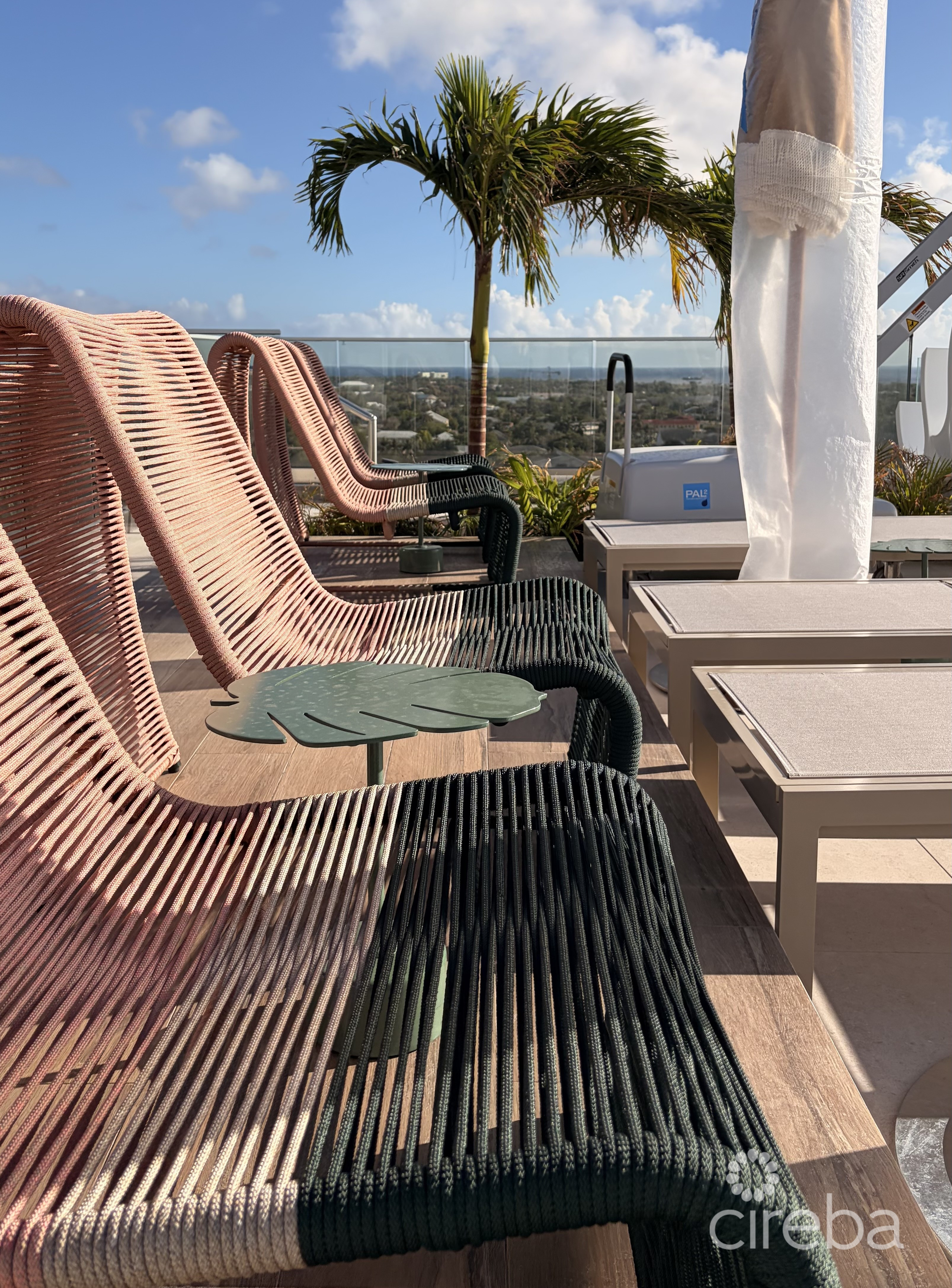 One bedroom, one bath with an articulated wall for adaptable space. It includes a full kitchen, a breakfast bar, a lounge area, and a spacious patio. #814 has impressive views to the West and North. Enjoy the sunset view all along Seven Mile Beach and West Bay. Agent-Owned Assignment